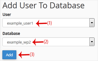 3. Role para baixo até o final da página e em Adicionar usuário ao banco de dados . Selecione um usuário na lista suspensa e escolha um banco de dados na lista.