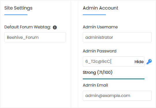 Observação: Copie o nome de usuário e a senha do administrador para o Bloco de Notas. Você precisará deles para acessar a área de administração do seu fórum Beehive mais tarde.
