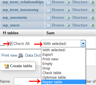 4. Role para baixo e marque Verificar tudo . Em seguida, clique na seta suspensa e selecione Reparar tabela .
