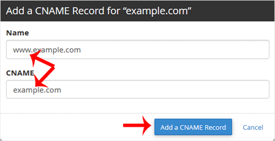 Os registros CNAME são referidos como registros de alias, pois mapeiam um alias para seu nome canônico. Você pode adicionar um registro CNAME usando a opção Zone Editor do cPanel.