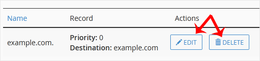5. Localize o registro CNAME que deseja editar ou remover. Caso deseje editar um registro CNAME, clique em Editar . Modifique os detalhes e clique em Salvar registro . A remoção de um registro pode ser feita com a opção Excluir .
